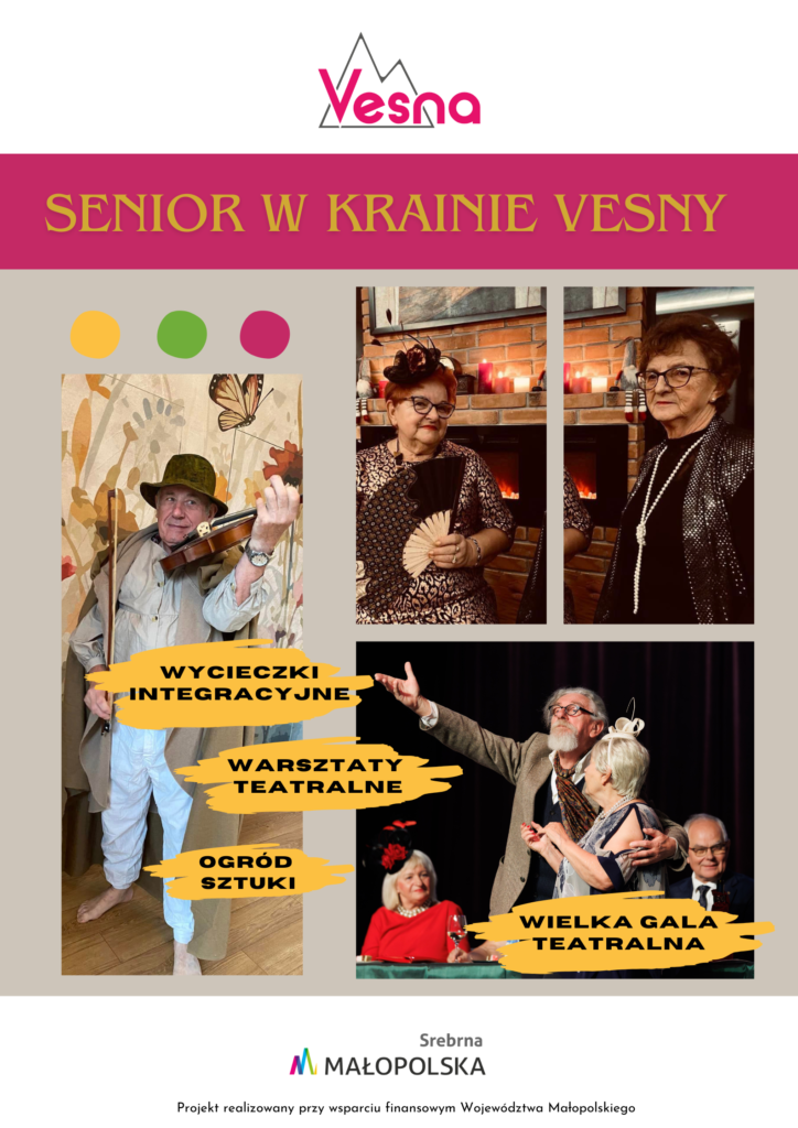 W Krainie Vesny wierzymy, że aktywne spędzanie czasu i bycie częścią społeczności to klucz do szczęścia i dobrego samopoczucia. Dlatego w ramach projektu „Senior w Krainie Vesny” zaplanowaliśmy mnóstwo atrakcji: wycieczki integracyjne, warsztaty teatralne, tworzenie ogrodu sztuki i… Wielką Galę Teatralną!